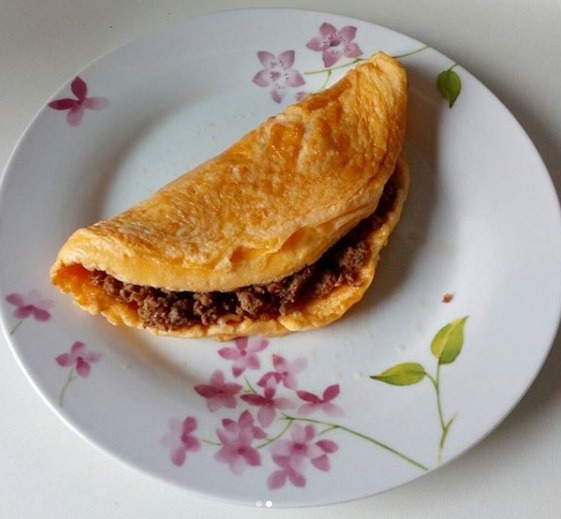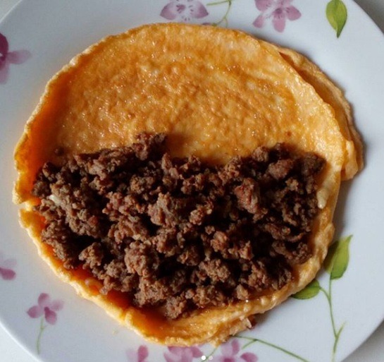 Kada ste zapekli jaja i dobili “palačinku” malo pre vađenja iz tiganja, dodajte i mleveno meso, preklopite i zapecite još malo. I to je to. Izvadite na tanjir i uživajte. Naravno i kod ovog jela možete biti kreativni i kombinovati začine i dodatke po želji i ukusu.